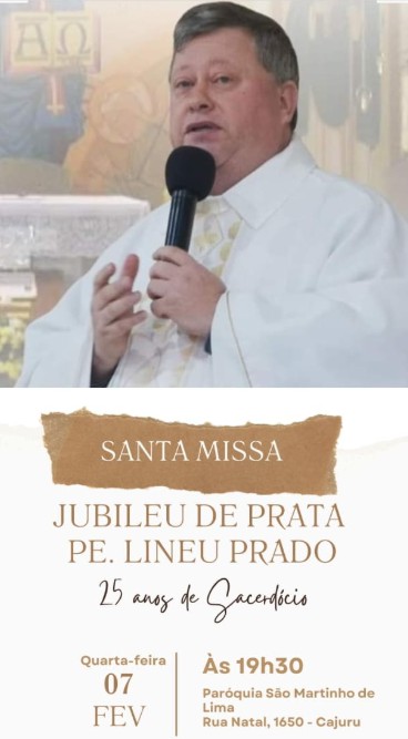 Padre Lineu Prado comemora 25 anos de sacerdócio Um dos mais queridos padres que já passsaram pela próquia são Martinho de Lima, o padre Lineu Prado, está comemorando neste ano de 2024, 25 anos de sacerdócio Convidamos a todos para a missa de comemoração dia 7 de fevereiro, às 19:30h, na igreja matriz, Rua Natal, 1650, Cajuru. Nascido em 25/09/1971, em Quitandinha/PR, filho de Davina e José Prado. Padre Lineu é o 17.o de 19 irmãos. Foi ordenado padre em 07/02/1999, por dom Pedro Fedalto. Padre Lineu, já passou pela paróquia São Martinho de Lima, pela paróquia do município de Palmeira/PR , de Campo Magro/PR e ocupa atualmente (fev/2024) o cargo de vigário da paróquia São Pedro Apóstolo, de Itaperuçu/PR. É entusiasta do movimento ECC, (Encontro de Casais com Cristo) e também participa da Renovação Carismática (RCC) e do Treinamento de Liderança Cristã (TLC). ![]() ![]() Padre Lineu Prado |